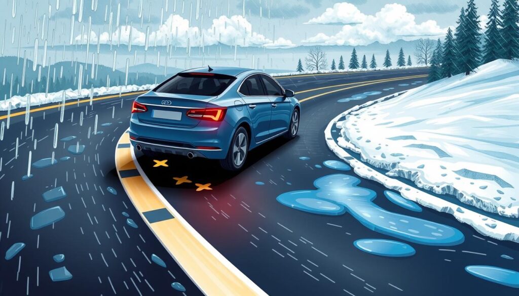 A detailed illustration depicting a car on a winding road under varying weather conditions, showcasing signs of wheel misalignment with uneven tire wear patterns. The background features rain-soaked asphalt, puddles reflecting storm clouds, and patches of snow on the side of the road, emphasizing the impact of environmental conditions on vehicle performance.